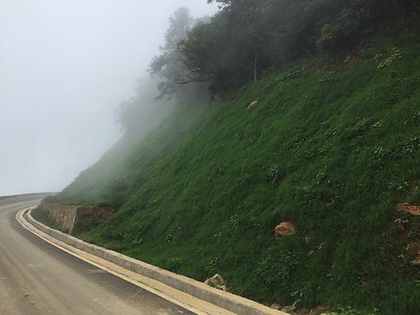 大熊山部分需要恢复的山体为石头山,外露部分是风岩石层,没有适合植物生长于附着的土质。陡峭而高大的山体由于没有植被保护,黄土裸露,土质疏松,遇暴雨天气形成泥石流,使山体更加脆弱。部分山体坡度陡峭,有的道路沿侧更是深谷,导致施工难度大,施工风险系数较高。